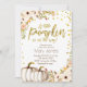 White & gold pumpkin invitation with floral background & gold confetti. Perfect for your baby shower party invitation. Elegantly rustic for fall season.