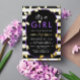Gold and purple It's a girl baby shower invitation sprinkled with gold foil baby footprints. Striped it's a girl baby shower invitation in a chic combo of black, purple, and gold foil. Retro girl baby shower invitation with stripes, baby feet, and purple details.