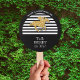 Keep your derby party guests cool with hand fans featuring your company's name, a faux gold glitter race horse on black and white stripes at the top and a solid black area at the bottom where we have the words "Talk Derby to Me" - change to anything for your occasion. MATCHING items in our store.