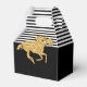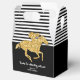 Derby-theme bridal shower gable favour boxes feature a racehorse in faux gold glitter on black and white stripes at the top and black at the bottom with your personal message. MATCHING items in our collection.