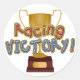 Shiny gold trophy sticker, with graphics of a gold tone cup style trophy. Colourful graphic text, across the middle reads, Racing Victory. Perfect as birthday party favours or award stickers for a race car themed boy's birthday party.