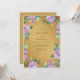 This design features a rich metallic gold backdrop adorned with lush clusters of watercolor blooms. Vibrant shades of lavender and violet purple petals contrast beautifully with soft teal and mint green foliage. The botanical arrangement evokes the airy feeling of spring blossoms such as hydrangeas or lilacs. A sense of opulent elegance makes this perfect for a formal or royal-themed event.