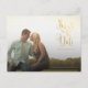 Gorgeous faux gold foil typography on the front of this designer postcard which you can upload into with your own engagement/save the date photo portrait. Easily and quickly personalise this designer professionally printed save the date postcard here and now by just typing over the example text and adding your own photograph. Elegant, chic, simple and classy gold script/cursive typography