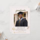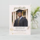 Academic portrait theme with warm gold accents on a soft cream background, featuring a centred graduate photo framed by subtle confetti details and small scholarly icons. Script and serif typography pair with a clean layout suited for college commencement announcements and campus celebration gatherings.