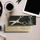 Elegant black and gold hair salon appointment reminder business cards with a pair of faux gold scissors Personalise by entering the information of the professional hairstylist or hairdresser.