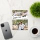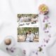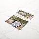Wedding save the date postcard you can personalise with four of your own photos, three smaller and one larger. Save our date is written diagonally across the postcard in a gold foil script. Add your names and wedding date in a clean font. Gold foil save the date postcard personalised with photos.