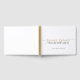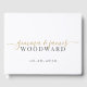 A simple modern minimalist typographic guest book featuring the bride and groom's first names in gold script and married last name in black serif type.