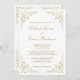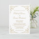 This elegant vintage-inspired formal wedding invitation features the text in gold-coloured script and serif fonts, framed by a delicate vintage gold vine motif. The reverse side provides space for wedding details, along with a QR code guests can scan to visit your website and RSVP, which saves the cost of printing and mailing separate RSVP cards.