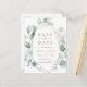 This wedding save the date announcement postcard features painted watercolor eucalyptus and botanical green leaves with a gold geometric frame.