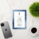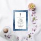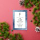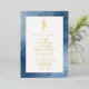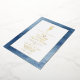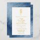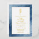 Stylish foil beach themed wedding invitation, with a blue marbled frame, on the front, with gold seahorse and custom gold foil text. Personalise the information for your beach wedding.
