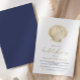 This elegant bridal shower invitation features a vintage illustration of a scallop shell in faux gold foil, above the words "bridal shower" in elegant gold colored handwriting script. Customize the rest of the text with the name of the bride-to-be in gold, and the shower venue and other details in navy blue. Ideal for a beach shower or wedding. The reverse side is a solid shade of navy blue.