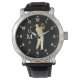 Here's an attractive watch that is perfect for the golf fan! It features a shiny gold silhouette golfer in full swing at the centre, with his triple monogram in matching gold running vertically at the left side. The numbers are also in gold, and everything is placed on a dramatic black background. Beautiful!