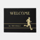A gold silhouette runner is at the bottom right of this door mat. Thin gold lines frame your family name or other custom text in matching gold, and the top text field, which is also customisable, currently says WELCOME. The image and text are placed on a black background.