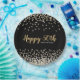 Add your own special touch to this elegant custom anniversary party plate design featuring sparkly gold and silver confetti over a black background, modern script typography with the words "Happy 50th" and the couple's names.
