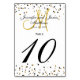Hollywood Glitz and Glam. Gold, Silver, Black and White Wedding Table Number Cards with custom gold monogram. Design by Elke Clarke ©. Printed glitter confetti design. Customise with your bride and groom names, newly weds last name, monogram initial and wedding date. Order one per table with each table number but still receive the bulk discount for total number ordered. Other colours available