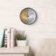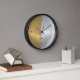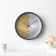 The size of the clock is dramatic and the abstract alcohol ink design is soothing and intricate at the same time. I chose the black frame that adds pop to the blue and gold design. The gold printing would be better in a slightly darker or larger font. I love it and I’m looking for just the right place in ny new apartment. I would recommend this clock for a personal gift or a present. I feel that the quality is excellent for the money! I’m a bit of a clock nut so I’m pretty particular about my purchases. The clock is larger in diameter than many if the clocks I have, so it stands out very well. I think a slightly darker printing color and a moderately larger size would best suit a professional decor or add more impact in a work place item.