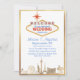 This wedding invitation features a classic Las Vegas theme. A skyline image of the Vegas strip is printed across the bottom portion in gold pattern. A matching gold frame borders the invitation. The classic retro "welcome to Las Vegas" sign is printed at the top. You can personalise the sign to include your own custom wedding information or other text.