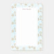 Sticky notes with a festive holiday repeating pattern of chic gold snowflakes drawn with elegant crystal shapes. A frosty light blue background. A white rectangle layered over top to write upon.