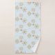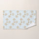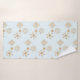 Bath towel with a festive holiday repeating pattern of chic gold snowflakes drawn with elegant crystal shapes. A frosty light blue background.