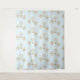 A tapestry with a festive holiday repeating pattern of chic gold snowflakes drawn with elegant crystal shapes. A frosty light blue background.