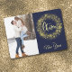 Two of your favorite photographs are the features on this pretty flat Holiday card. The photo on the front is bordered by an image of a sparkling gold snowflake wreath. The stylized text at the center in pale gold says "MERRY CHRISTMAS". Everything is placed on a dark blue background. Your second photograph on the back is bordered with an image of a silver Christmas tree and your own custom text in three easy to change text fields. Elegant!