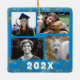 Gold snowflakes tree ornament in bright blue with four photo templates and year date. Upload four photos on this square ornament with year in bold white text at bottom. Customise both sides- or choose the square single-sided ornament with a metal frame which will show the front (photos and year) only. Choose only the square size option - ornament will print as you see it!