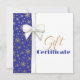 Luxury and rich holiday design featuring splendid Christmas gift bow and golden snowflakes pattern on a blue background. This festive gift certificate is perfect for your small business or to gift friends and family.