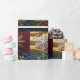 Wrapping paper with gold filagree snowflakes on red, blue, green images of velvet with one white snowflake on an image of gold velvet. Together they are repeated into a richly coloured wrapping paper.