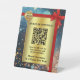 Festive sparkling business tabletop sign template with a red ribbon on gold. Easily to customise with your company logo, QR code and texts. Great for a retail business or hotel, showing customers the latest Christmas holiday discounts.
