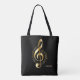 Modern shiny gold treble clef with notes on black background. Optional monogram