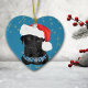 On this ornament, a beautiful watercolor portrait of a black Labrador Retriever Dog wearing a red and white Santa hat and a paw print collar is on the front. Gold stars shine all around the dog. Everything is placed on a blue sky background. The back of the ornament has the same blue background with gold stars, and three text fields for you to customise.