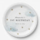 This cute birthday paper plate features faux gold glitter stars and fluffy blue clouds on white background. Change the background colour and personalise it for your needs. Perfect for a "Twinkle Twinkle Little Star" birthday party! You can find matching products at my store.