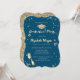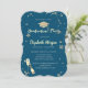 Gold glitter graduation cap, champagne glass, and stars on blue background.