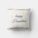 Beautiful throw pillow with Happy Hanukkah in decorative writing.