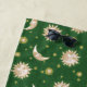 Miss Sun and Mr Moon in gold meet on this artful forest green beach towel.