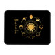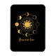 Centre sun graphic surrounded by a circle of moon phases in gold on black background. Add your name, company, brand or other special message to personalise in gold coloured modern script text.