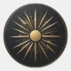 An elegant round sticker design with a geometric sunburst in fine gold lines on a matte black background. Ideal for journals, gift tags, or cosmic-themed packaging.