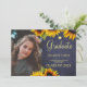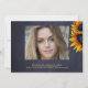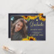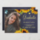 Floral elegant graduation announcement card featuring sunflowers bouquets and a faux gold chic typography script over a dark midnight navy blue chalkboard background.+++++++++ Easy to personalize with your name, school and class, your custom text, and 2 photos on both sides!