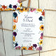 Colourful fall floral mix borders this wedding invitation. Navy blue and plum purple calla lilies, gold sunflowers and pink protea flowers are the perfect bouquet for your fall wedding invitations. Floral border even includes roses and orange tiger lilies. This fall sunflower wedding invitation is versatile for indigo, orange and magenta colour mixes.