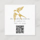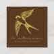 Modern square business card features gold vintage swallows bird illustration on dark brown background with contemporary text on front, and customisable QR code for your website or social media on back.