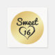 Round gold paper napkin features the number 16 in an open heart with Sweet written above.