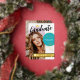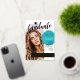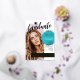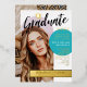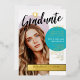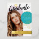 Retro graduation party invitation personalised with an arch-shaped photo on the cover and a second photo covering the back. Graduate written in black brush script across the graduation invitation. Gold and teal accent colours. Stylish and girly graduation invitation in teal, white, black, and gold foil