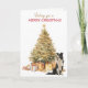 On the front of this Christmas card, a beautiful black and white Border Collie dog sits in front of a Holiday tree. The tree is decorated in gold, and matching gift packages are beneath it. The gold and red text says "Wishing you a MERRY CHRISTMAS". Inside text fields which you may customize to anything you'd like. Be sure to see the other dog themed cards and gifts in our store.