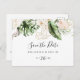 This gold tropical foliage horizontal save the date postcard is perfect for a rustic wedding. The design features hand-painted watercolor gold and tropical green foliage with elegant blush flowers.