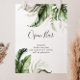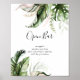 This gold tropical greenery wedding open bar sign is perfect for a modern wedding. The design features hand-painted watercolor gold and green palm and banana leaves with pink flowers neatly arranged into beautiful bouquets.