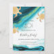 This beach themed birthday invitation features gold tribal turtles on an white teal gold ink background and a custom text in a modern artistic font and an elegant handwritten script.