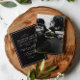 Romantic photo wedding invitation with YOU ARE INVITED printed between greenery in gold foil atop your photo. Gold foil photo wedding invitation with your wedding invitation wording in white against matte black on the other side of the informal wedding invite. Autumn wedding invitation or winter wedding invitation personalised with a photo with gold foil details.