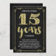 This swanky, stylish 15th wedding anniversary party invitation features vintage typography, elegant flourishes, brush script calligraphy, faux gold foil, and a chic black background.