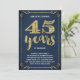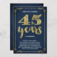This swanky, stylish 45th wedding anniversary party invitation features vintage typography, elegant flourishes, brush script calligraphy, faux gold foil, and a chic navy blue background.