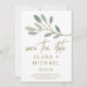 This gold veined eucalyptus save the date card is perfect for an elegant wedding. The simple and dainty design features faux gold glitter layering the branches of olive green leaves.